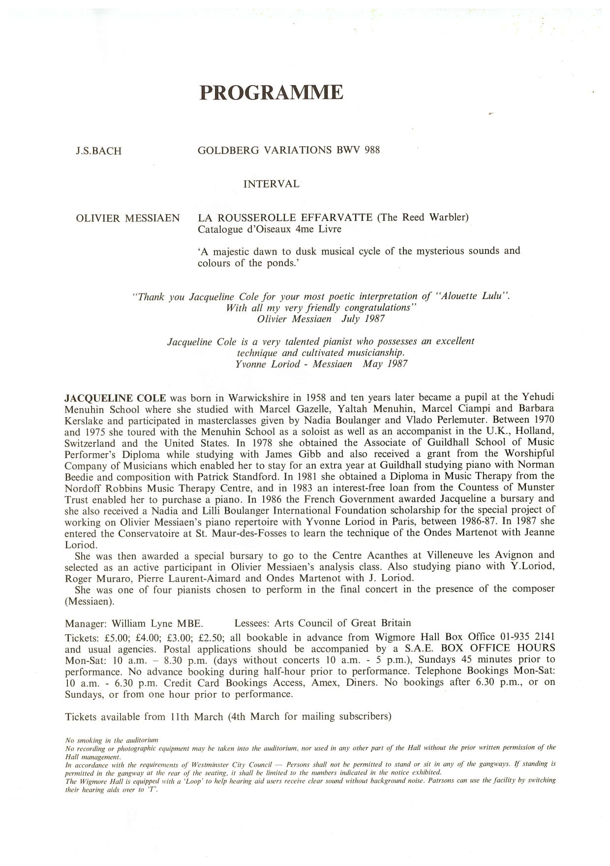 Piano Recital at Wigmore Hall, 29th October 2003